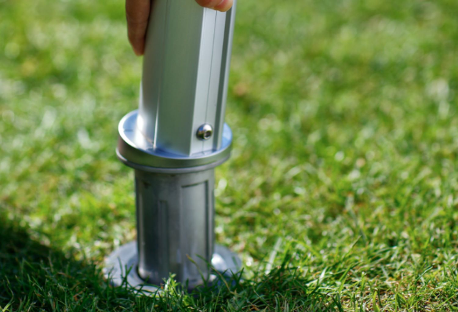 Grâce à des bases d'ancrage discrètes affleurant le sol (vendues séparément), vous pouvez installer et retirer vos mâts de fixation en toute simplicité. Cette solution ingénieuse vous permet de réorganiser votre espace extérieur selon vos besoins. Vous pourrez ainsi libérer rapidement la zone pour des tâches telles que la tonte de la pelouse ou le rangement hivernal.
